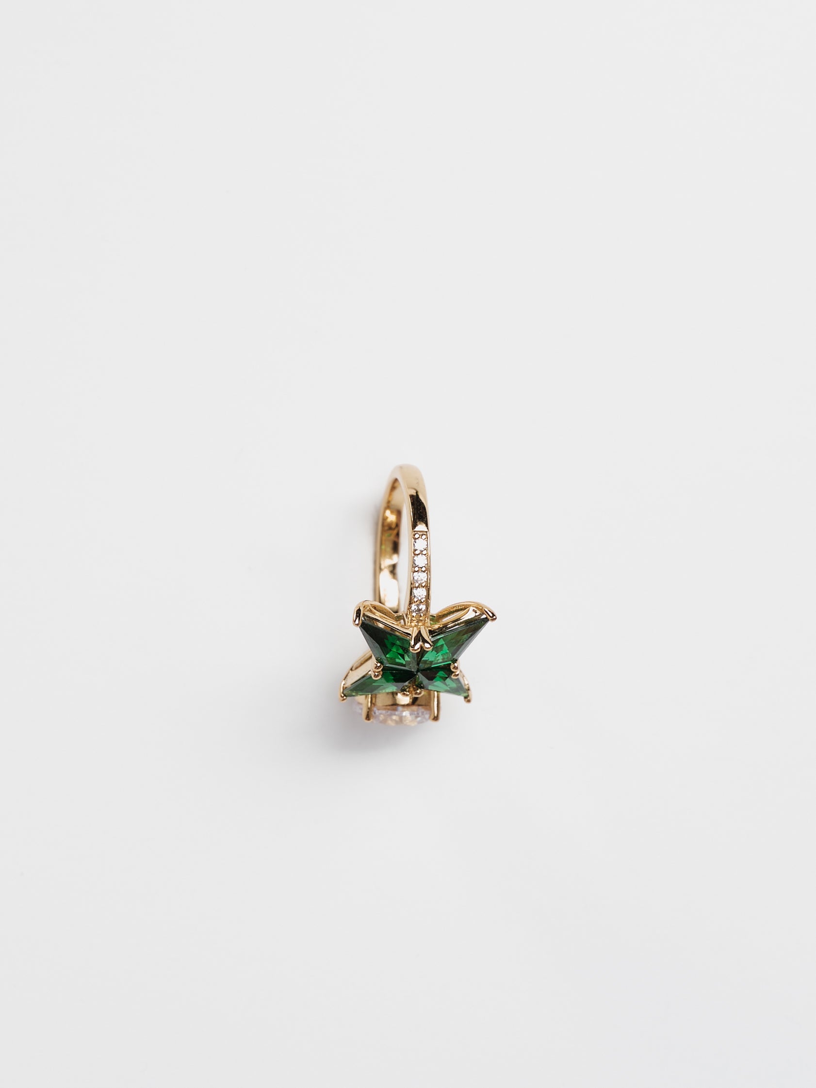 This diamond solitaire and emerald star ring features an open-front design showcasing a brilliant solitaire diamond, while the band is adorned with radiant diamonds, making it perfect for those seeking an elegant and refined statement piece.